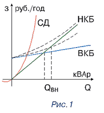 В варианте с ВКБ необходимо учитывать затраты, обусловленные дополнительными потерями электроэнергии, вызванными передачей РМ QВ через трансформатор и линию.Функция данных затрат имеет квадратичный характер и зависит от активных сопротивлений трансформатора и линии. Дополнительные затраты увеличивают стоимость варианта с ВКБ (пунктир на рис. 1) и соответственно значение QВН.